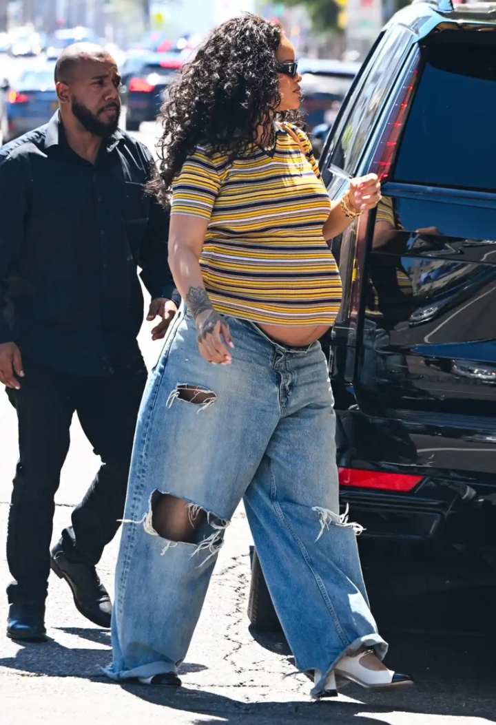 For the outing, Rihanna opted for a laid-back yet fashion-forward look: unbuttoned baggy jeans paired with a cropped striped T‑shirt. The ensemble perfectly showcased her baby bump, celebrating the beauty of pregnancy rather than hiding it.